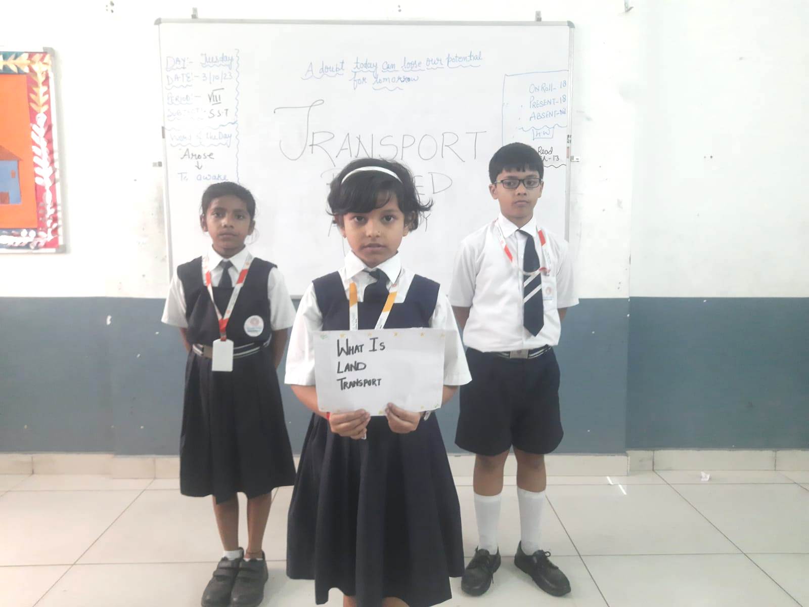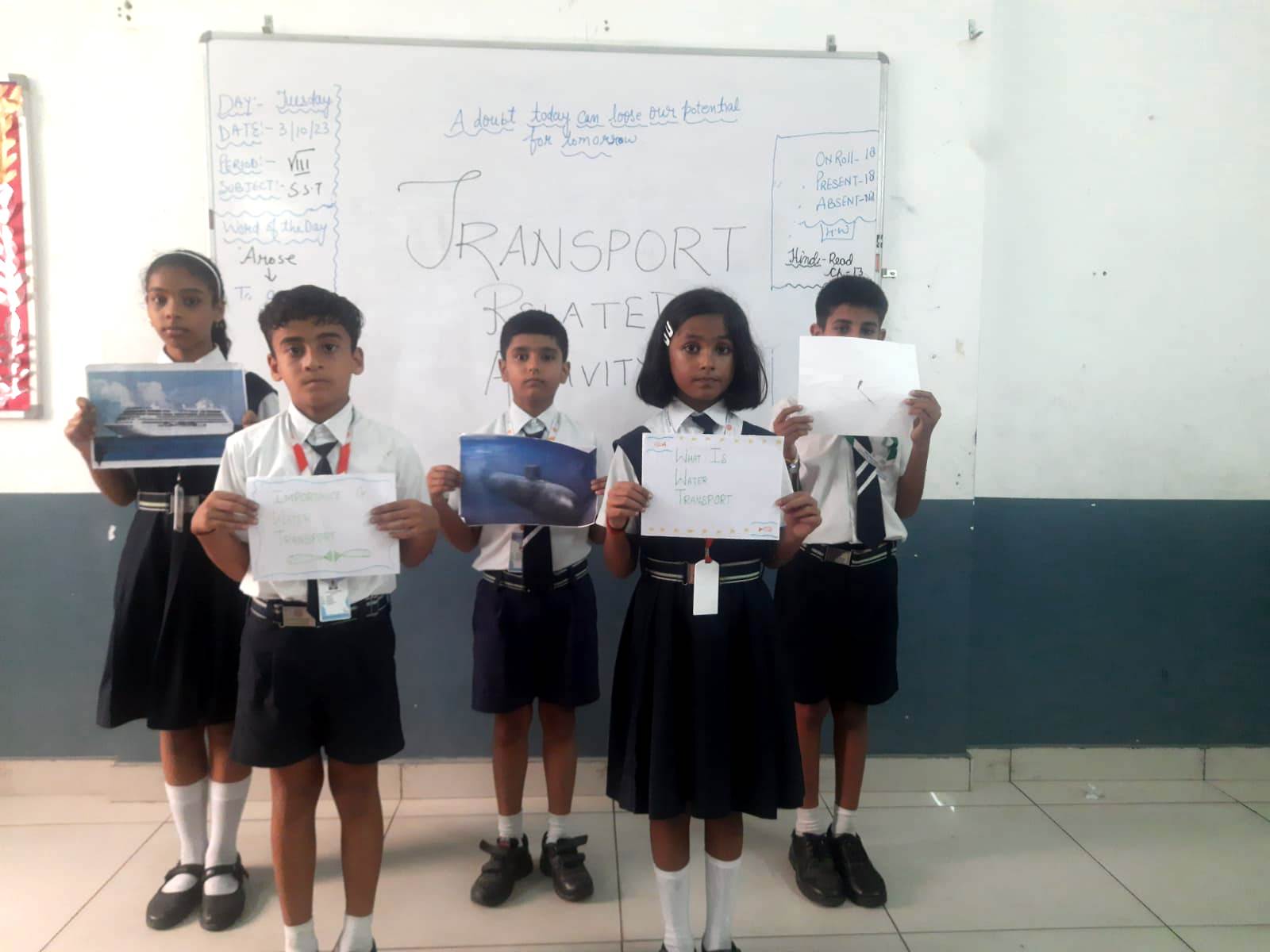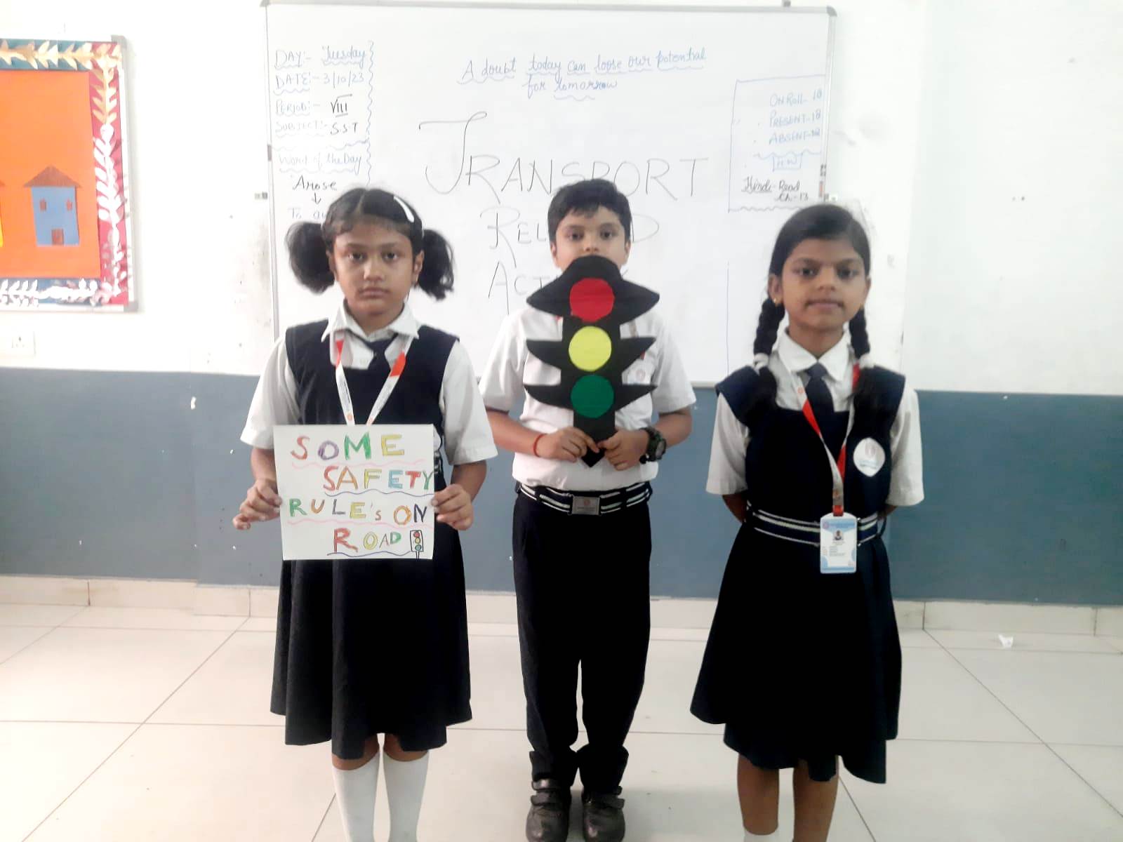 In our engaging session of activity which was held on 3-10-23 (Tuesday) Class 4-B focused on transportation, students delved into the significance of land, air, and water transport modes, shedding light on how they connect the world. With an informative video they created, these young minds beautifully articulated the importance of traffic signals and road safety, emphasizing the crucial role they play in ensuring safe journeys for all. This hands-on learning experience not only broadened their horizons on transportation but also instilled a strong sense of responsibility for road safety in our budding scholars.