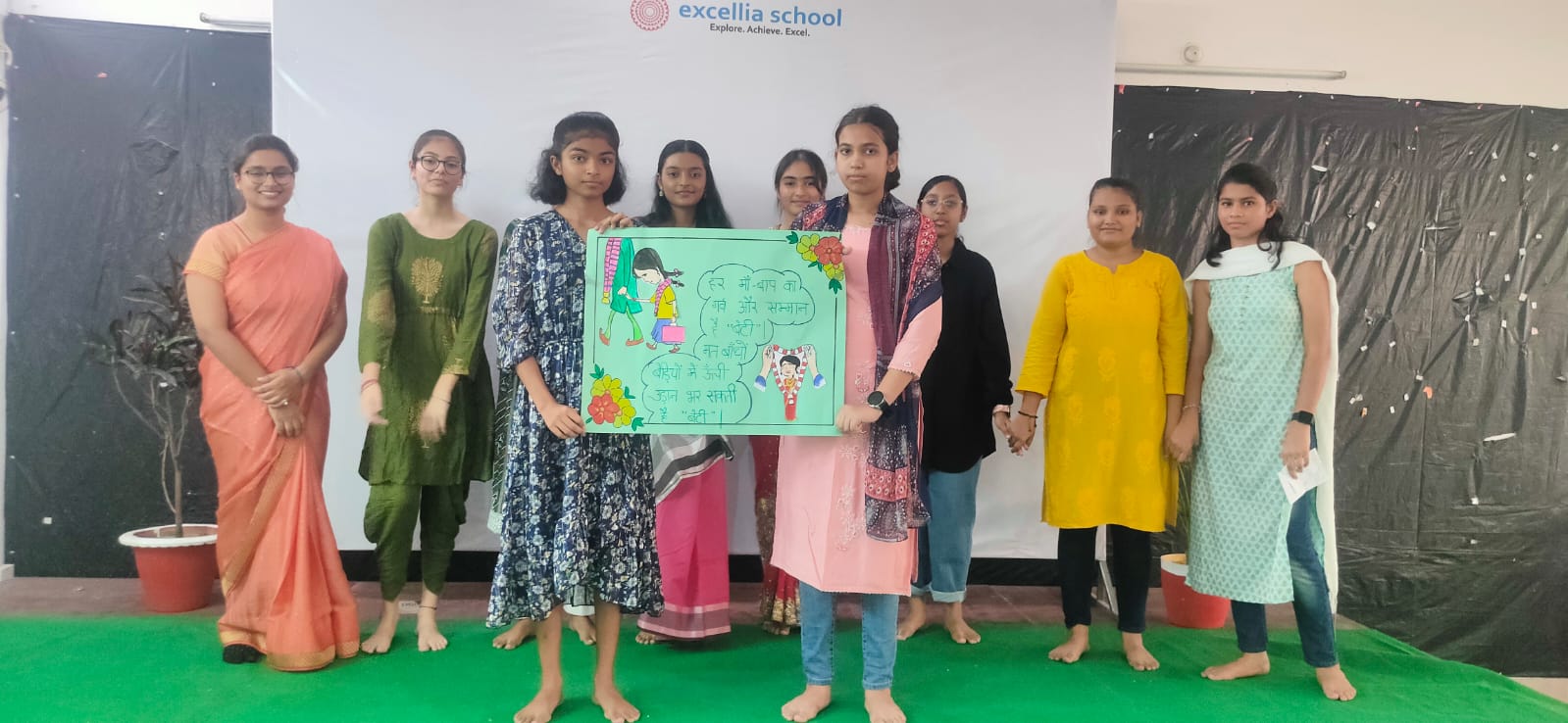In the eyes of every girl lies the hope for a brighter tomorrow. It is our responsibility to empower them. Excellia School observed this important day by the presentation of a wonderful play presented by the female student’s of senior wing. The theme of the play was educating girl child. The play portrayed the pity condition of a girl child who suffered severe pock marks and a stammered speech which hampered her confidence. It was her teacher who instilled confidence in her by educating her that when she grew up and at the time of her marriage, the groom who was double her age demanded dowry. She saw the miserable condition of her parents and immediately called off the wedding that left everyone in a state of shock. She thanked her teacher for instilling that confidence in her by always believing that a fate of a girl can only be given a right direction through education. It was a beautiful presentation and the students performed exceptionally well while perfectly delivering the central theme of the play.