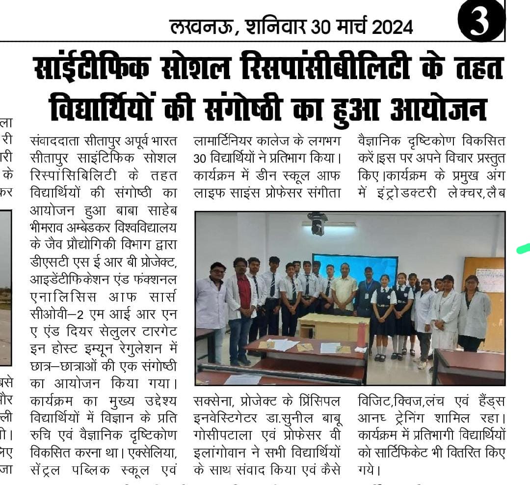 Under the visionary leadership of ๐Œ๐ซ๐ฌ. ๐๐ซ๐ข๐ฒ๐š๐ง๐ค๐š ๐ƒ๐ฎ๐›๐ž๐ฒ , Excellia School students explored scientific social responsibility at Ambedkar University’s Immunology Department. Guided by ๐Œ๐ซ. ๐Œ๐š๐ง๐จ๐ฃ ๐’๐ข๐ง๐ ๐ก , they delved into SARS-CoV-2 miRNAs’ roles in immune regulation, gaining insights from ๐ƒ๐ซ. ๐’๐ฎ๐ง๐ข๐ฅ ๐๐š๐›๐ฎ ๐†๐จ๐ฌ๐ข๐ฉ๐š๐ญ๐š๐ฅ๐š on the virus’s workings. Discussions with ๐ƒ๐ซ. ๐•. ๐„๐ฅ๐š๐ง๐ ๐จ๐ฏ๐š๐ง highlighted bat-mediated virus spread, while๐ƒ๐ซ. ๐’๐š๐ง๐ ๐ž๐ž๐ญ๐š ๐’๐š๐ฑ๐ž๐ง๐š provided practical knowledge on gene expression. A laboratory visit showcased biotechnological tools, inspiring a commitment to combat global health challenges. This transformative experience empowered students ๐ˆ๐ฌ๐ก๐š๐ง ๐๐ซ๐š๐ญ๐š๐ฉ, ๐’๐ก๐ฎ๐›๐ก ๐†๐ฎ๐ฉ๐ญ๐š, ๐’๐ก๐ข๐ค๐ก๐š๐ซ, ๐๐š๐ซ๐ญ๐ก๐๐จ๐ซ๐ฐ๐š๐ฅ, ๐๐จ๐จ๐ซ๐ฏ๐ข, ๐’๐ก๐ซ๐ž๐ฒ๐š, ๐€๐๐ข๐ญ๐ข, ๐€๐ฌ๐ก๐ฆ๐ข๐ญ, ๐๐š๐ซ๐ญ๐ก ๐ฌ๐ข๐ง๐ ๐ก & ๐€๐ญ๐ก๐š๐ซ๐ฏas agents of positive change, ready to contribute to infectious disease mitigation and public health initiatives.
